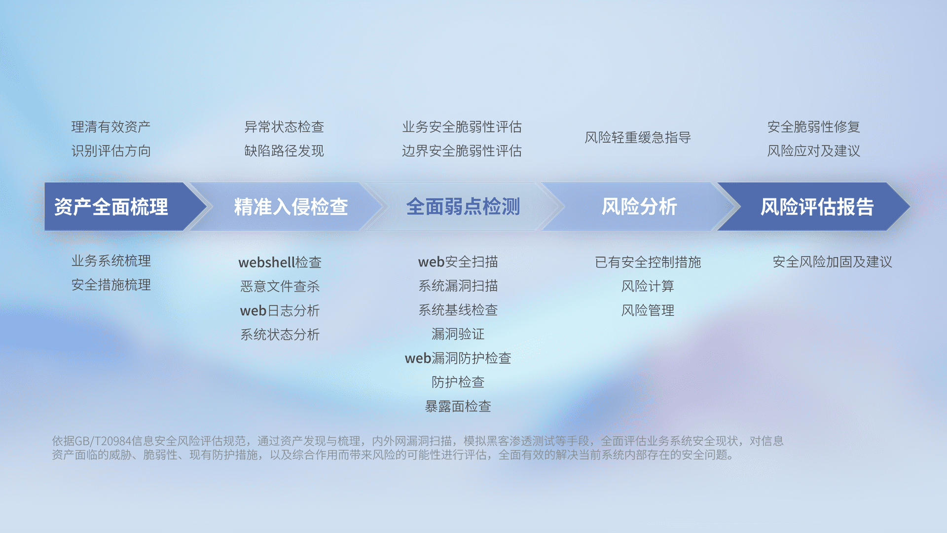 针对客户行业特性,,,以专业的安全服务+多厂商联合解决方案提供专属的一站式安全管理服务,,帮助客户全面感知网络空间威胁,,,基于识别、、、检测、、、、分析、、防护、、、监测、、、、响应的服务理论模型,,从方案咨询、、集成交付、、评估验证、、、优化加固、、运维运营,,,致力于为客户提供完整的闭环管理式安全服务。。。以实战经验为客户打造高抵御风险的安全体系,,,,帮助客户发现威胁、、对抗威胁、、、、处置威胁,,,,不断积累安全对抗能力,,持续保障数字化安全。。